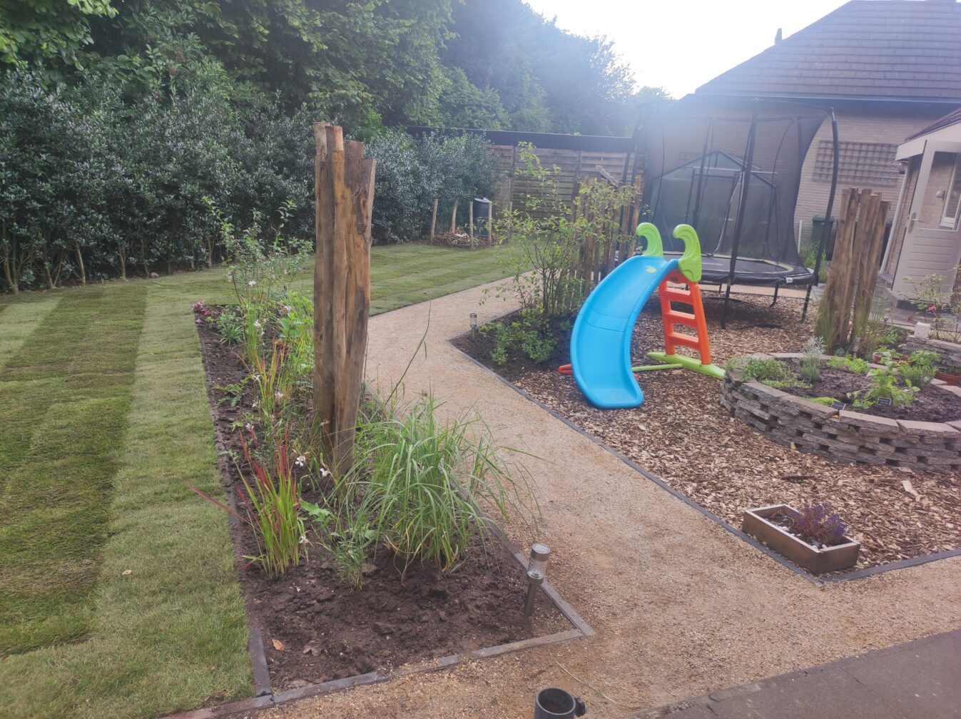Deze tuinrenovatie combineert functionaliteit en natuurlijke elementen tot een harmonieuze buitenruimte. Centraal in de tuin staat een ruime kas, ideaal voor het kweken van groenten en kruiden. De tuinpaden van halfverharding zorgen voor een natuurlijke uitstraling en een prettige looproute door de tuin. Er is een speelse en kindvriendelijke indeling met een kleurrijke glijbaan en […]